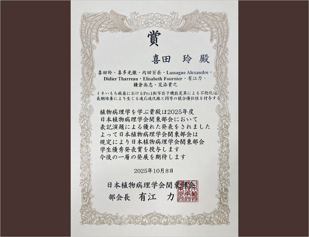 2025年度日本植物病理学会関東部会において本学大学院生が学生優秀発表賞を受賞