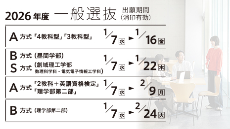 | 4教科型 | 3教科型 | 2教科+英語資格検定 | 理学部第二部 | |||||||||||