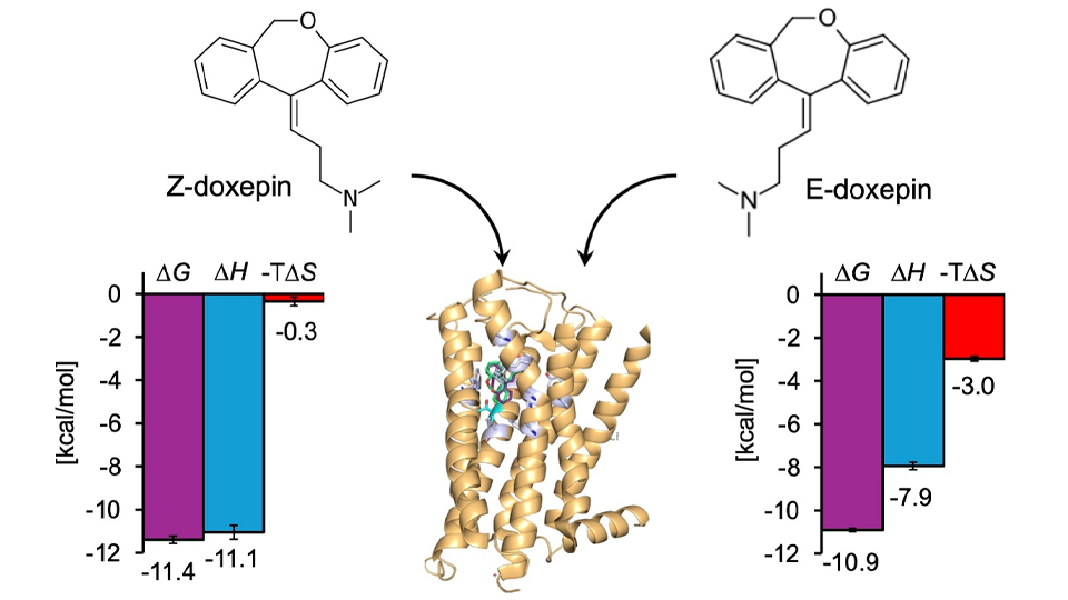 Doxepin, a tricyclic antidepressant, is also a potent antihistamine targeting H1R and exists as a mixture of E- and Z-isomers. In a previous study, the team reported that the Z-isomer exhibits approximately five times higher affinity for H1R binding than the E-isomer. They also identified a key threonine residue (Thr1123.37) that contributed to this isomer-dependent selectivity. In the current study, the researchers performed a detailed thermodynamic analysis of the H1R-doxepin interaction to clarify this selectivity.