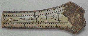 動物の角に十個一組の穴が縦2列にあけてあり、この穴に木製のピンをさし て計算する。
