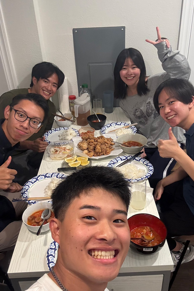 夏休みや冬休みに、アパートに集まって唐揚げやパスタを作って一緒に食べたりしました。大学のことでわからないことがあれば聞き合うなど情報共有をよくしています。