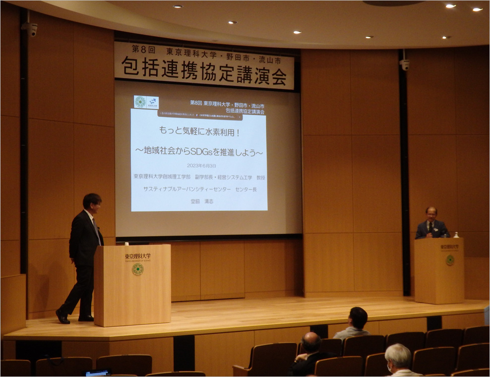 2023年6月3日(土)に、本学野田キャンパス7号館6階講堂において、野田市・流山市と本学との包括連携協定に基づく第8回の講演会が開催されました。 開催に際しては、オンライン(Zoom)の同時配信で本学創域理工学部 経営システム工学科 堂脇…