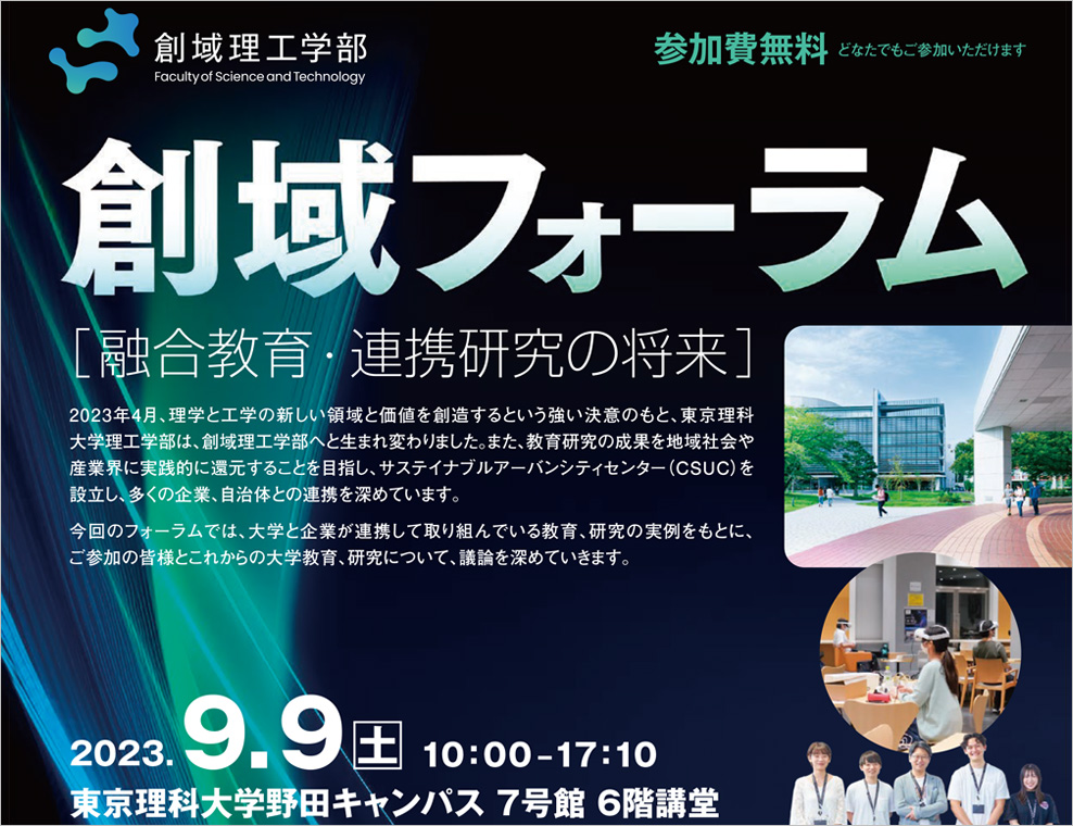 2023年4月、理学と工学の新しい領域と価値を創造するという強い決意のもと、東京理科大学理工学部は、創域理工学部へと生まれ変わりました。また、教育研究の成果を地域社会や産業界に実践的に還元することを目指し、サステイナブルアーバンシティセンタ…