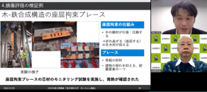 続いて、本日のテーマとなる地震被害の事例に話が進みます。現行の被災度診断として、地震発生後すぐに応急危険度判定が行われます。これは二次的災害の防止のためでありますが、震災後しばらく経ってからは復旧可否を判断する診断として被災度区分判定が行われたり、被害認定調査が行われたりすること等の説明がありました。実際に能登半島地震後に、被害状況を調査した動画を交えて解説されました。