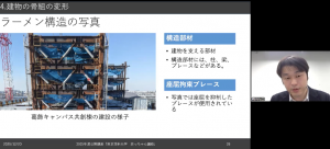 各種センサについて発熱から温度を知ることができる「熱伝導解析」とその「逆解析」、「損傷評価のフロー」「損傷評価の検証例」についても解説があり、「地震が起きた時、私たちの身の回りの建物の揺れの程度を温度からも知ることができます。」と述べて、講演を締めくくられました。