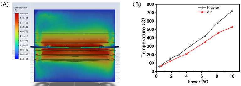 発電評価のため、高強度を有するイットリア安定化ジルコニア(YSZ)を用いてマイクロリアクターを作製し、内部に空気(酸素)や水素などの燃料ガスを導入できるマイクロ流路を形成しました。リアクター中央部には、太陽誘電株式会社が開発した金属支持型SOFCセルを搭載しました(図1、[2])。このセルは急速な昇温にも耐えうる高い熱安定性を有しています。さらに、筐体には耐熱性樹脂を用いた3Dプリンター造形を採用し、内部に宇宙産業でも使用されるアルミニウム蒸着カプトンフィルムを積層して輻射熱を抑制しました。また、内部ガスをクリプトン(Kr)に置換することで、断熱性能をさらに高めることができました。これにより、約10-15 Wという低いヒータ出力で、SOFCの動作温度である600℃以上へ昇温できるようになりました(図2)。
