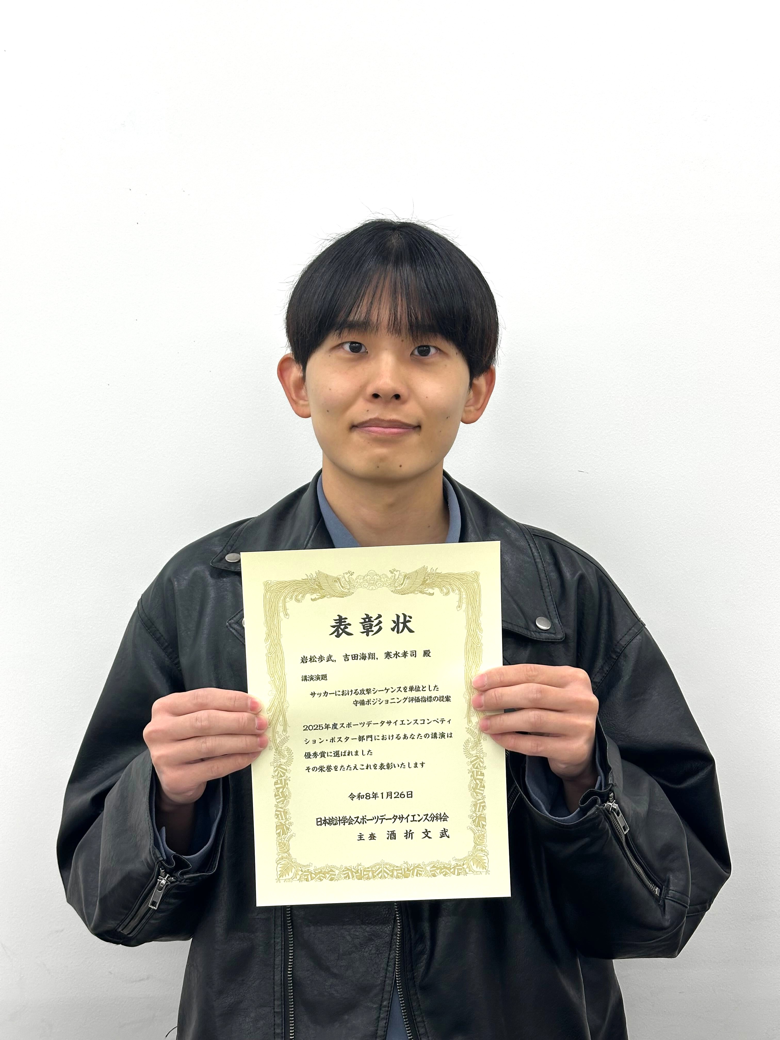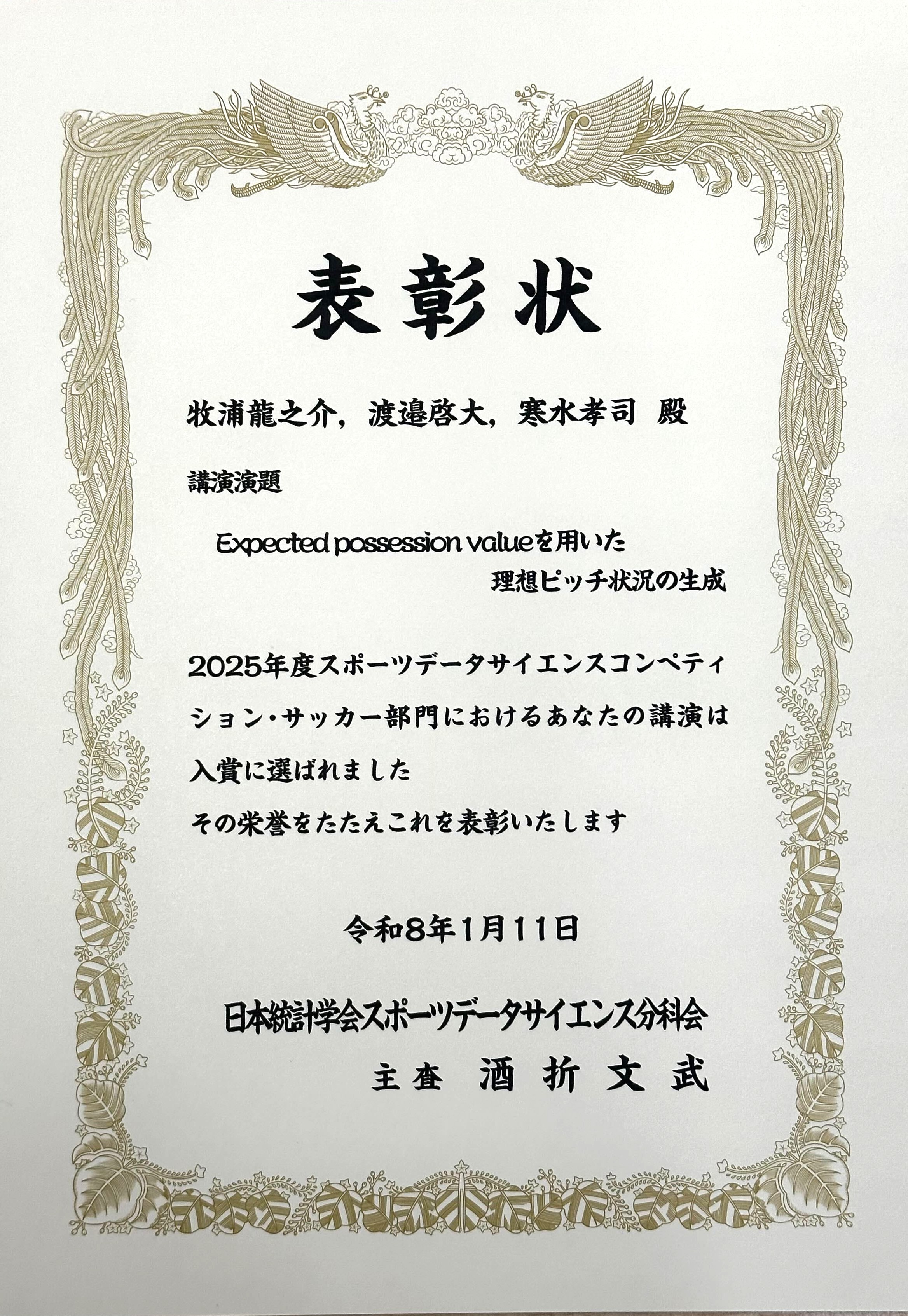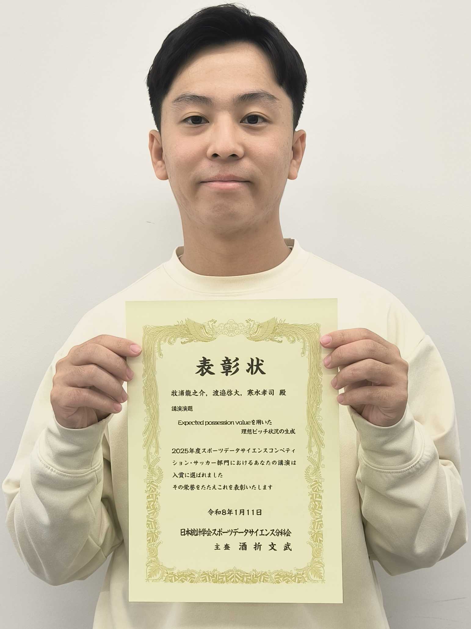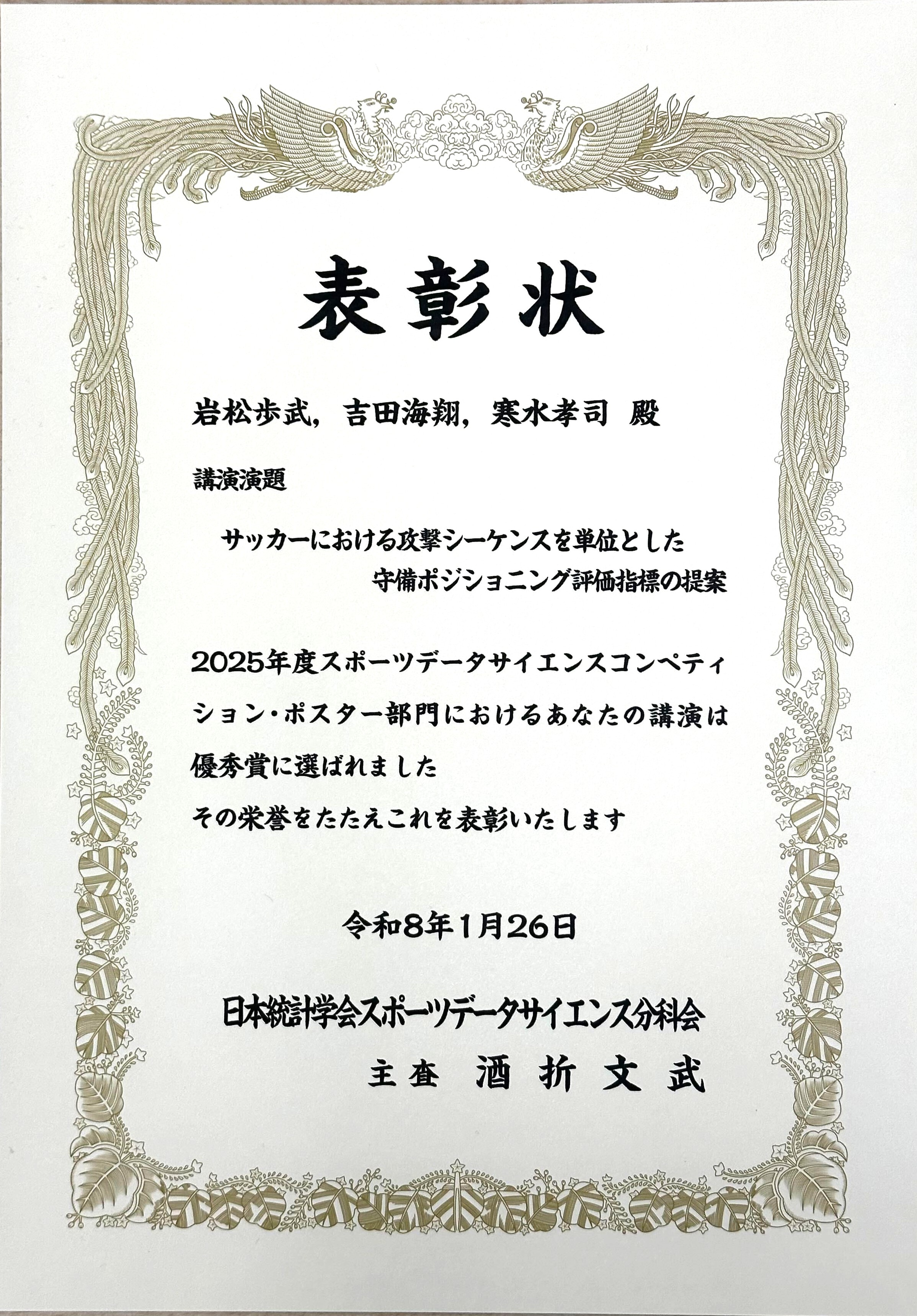 2026年1月10日、11日に中央大学後楽園キャンパスにて開催された2025年度スポーツデータサイエンスコンペティション審査会(日本統計学会スポーツデータサイエンス分科会、情報・システム研究機構統計数理研究所 主催)にてポスター発表を行い、優秀賞を受賞した。